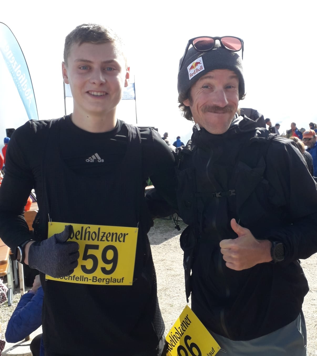 Nach ein paar Gehpausen liefs ab der Mittelstation (1.080 Meter) wieder besser. Der Sechzehnjährige mobilisierte auf dem 500 Meter langen steilen Schlussanstieg alle Kräfte, erreichte den Hochfelln (1.674 Meter), die „Aussichtsterrasse“ des Chiemgau, unter einer Stunde. In 59:56 Minuten wurde er Zweiter in der Jugendklasse. Zeit blieb für ein Selfie mit Ultramarathon-Läufer Florian Neuschwandner (PTSV Rosenheim), der seit 2021 den 100-Kilometer-Weltrekord auf dem Laufband mit 6:26:08 Stunden hält.