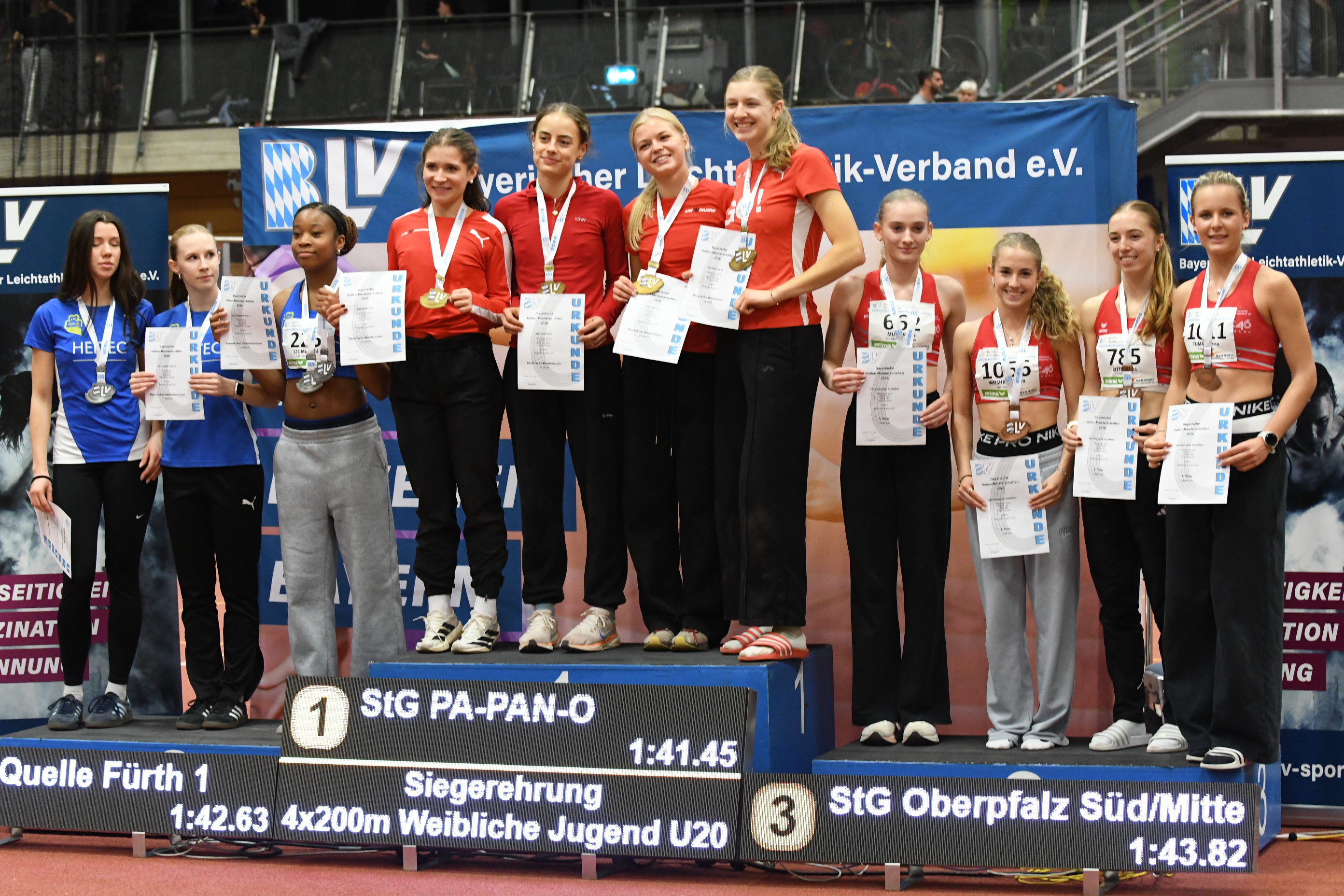 Auch sie hatte auf dem Heimweg eine zweite Medaille im Gepäck. Die StG PA-PAN-O mit den drei LAC-Athletinnen Plöchinger, Ketzel und Walz sowie Lange aus Pfarrkirchen gewann souverän Gold in der 4 x 200-Meter-Staffel in erstklassigen 1:41,45 Minuten. Alle vier überzeugten mit guten Wechseln und starken Läufen auf der Hallenrunde.